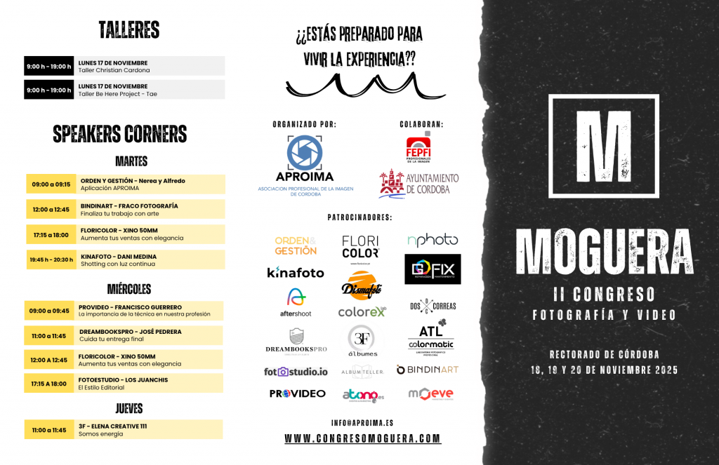 En estos días tendrá lugar el 2º Congreso Internacional de Fotografía y Vídeo de Bodas. Durante los días 18, 19 y 20 de Noviembre, el Rectorado de Córdoba se convertirá en punto de encuentro del sector profesional de foto y vídeo. En Moguera 2025, empresas, marcas, expositores, talleres y profesionales del ámbito audiovisual y de la fotografía, ofrecerán lo mejor de ellos mismos a estudiantes, amantes y profesionales del sector.